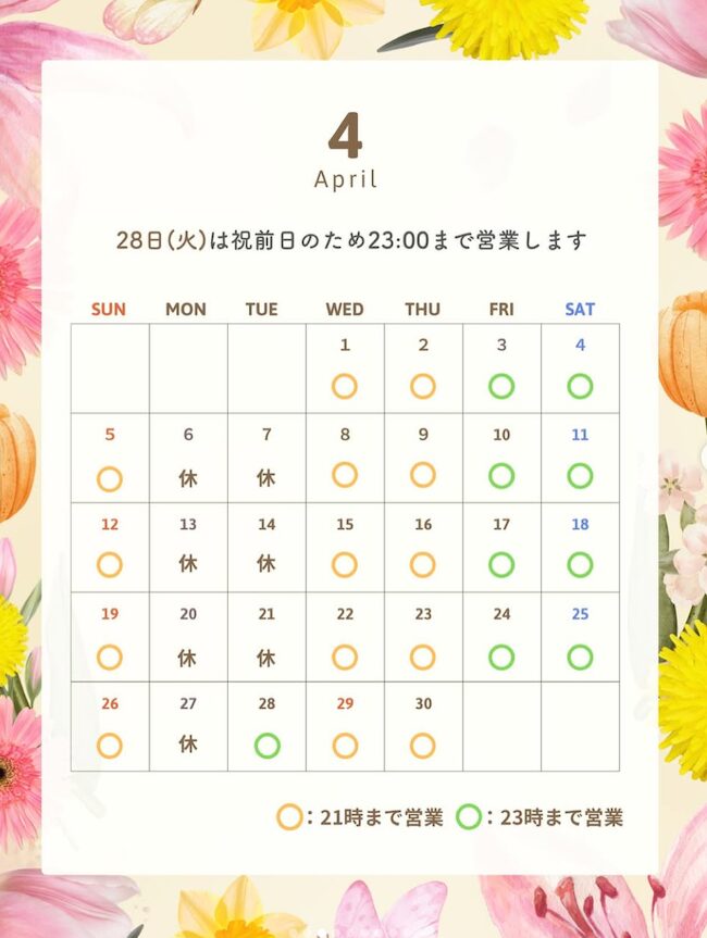 2026年 4月の営業時間